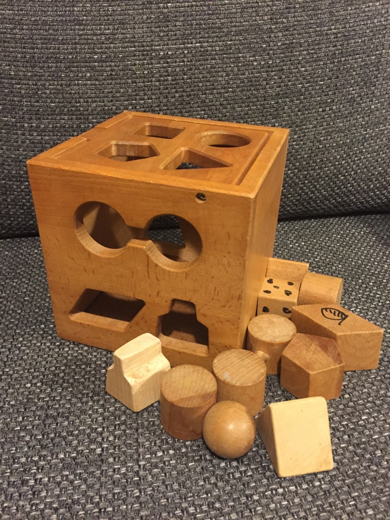 非常に物持ちが良い義理の実家。そんな義実家から、「昔うちの子どもたちが使ってたものをあげる」と送られてきたのが、河合楽器の『パズルボックス』。いわゆる型はめのおもちゃです。夫が遊んでいたものなので、かれこれ30年近く前のおもちゃです。年季が入っています。木のおもちゃが良いなと思うのは、時間がたっても古臭くなく、むしろ味が出てくるところにあります。