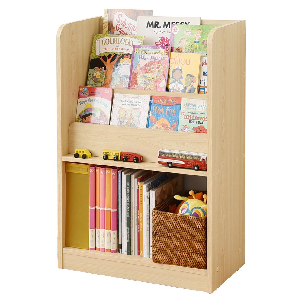 よくこういう、洒落た子ども用本棚を見かけますが、私は良くないと思いますね。大人でも手前の本以外取りにくいですよね。1歳も後半になると、背表紙で絵本は特定できます。表紙を見せておく必要性は乏しいです。大体収納力も落ちます。
